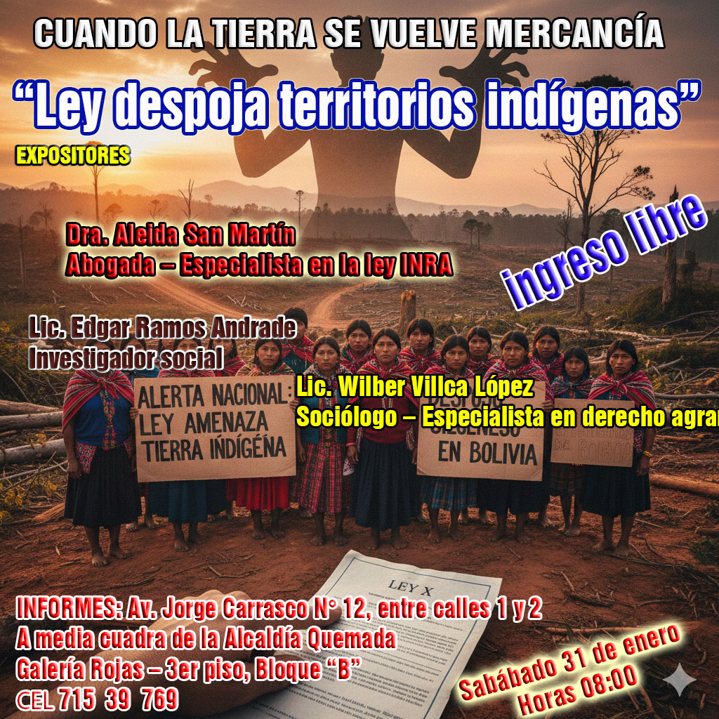 El evento tiene como objetivo generar un espacio de análisis crítico, jurídico y social sobre los impactos del proyecto de ley en los derechos territoriales, la autodeterminación de los pueblos indígenas y la seguridad jurídica agraria, y está dirigido a autoridades indígenas, organizaciones sociales, sociólogos, estudiantes y profesionales del derecho.